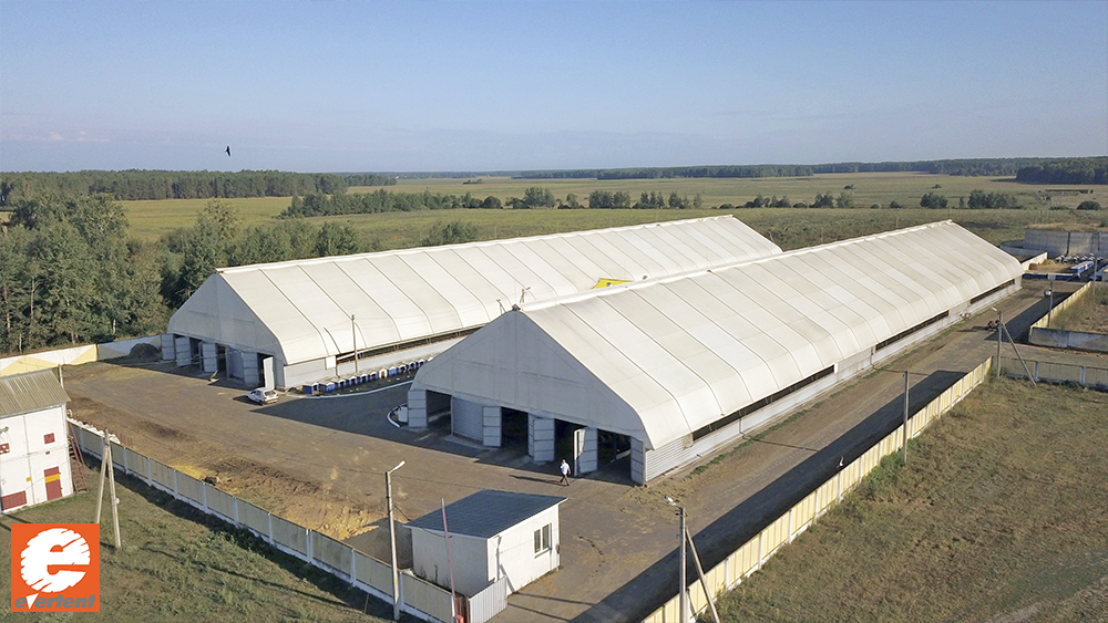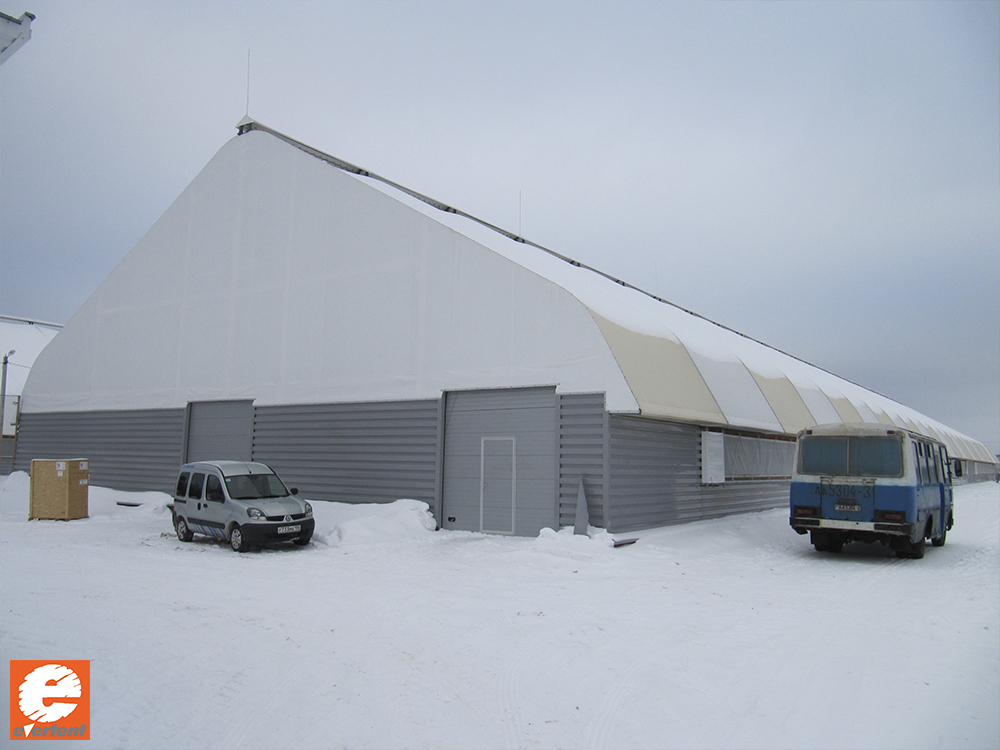 Проектируя каркас именно под тент, используя технологию сварки ТВЧ и крепление через алюминиевые направляющие, мы имеем свой самый первый ангар, построенный в 2009 году, в действующем виде.
