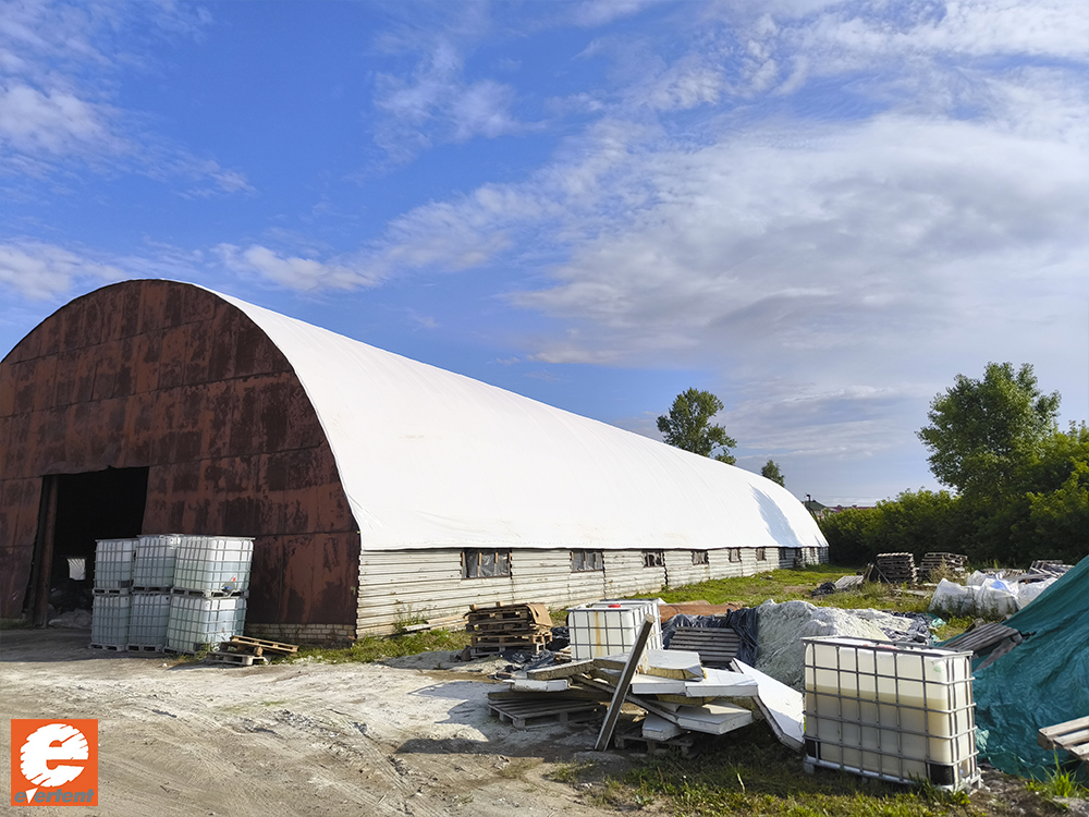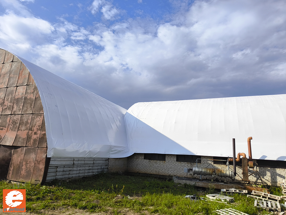 Суть проекта заключалась в покрытии тентовыми полотнами всей поверхности арочного ангара. Для защиты полотен от возможных порывов выступающими металлическими элементами, было принято решение уложить мягкую прослойку между тентом и жестяной кровлей.